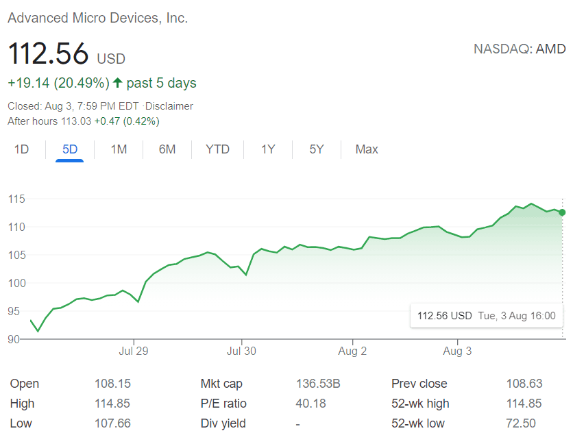 Nvidia의 Arm 인수가 영국 정부에 의해 차단될 수 있다는 보도가 나온 이후 AMD 주가는 5일 연속 신고가로 마감하였습니다.